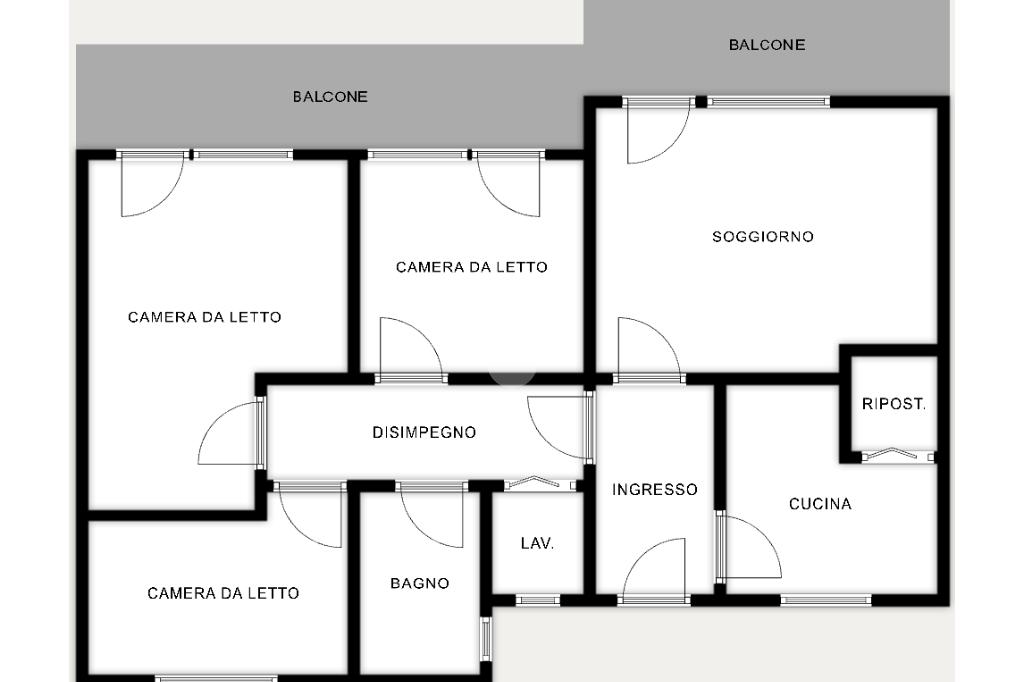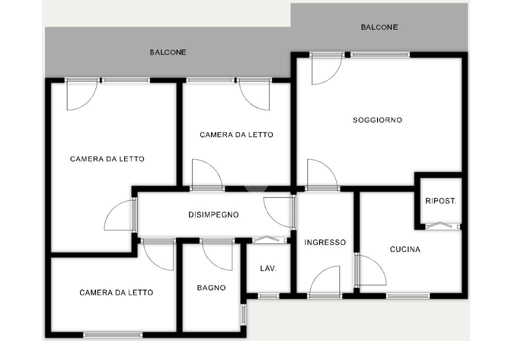 L'appartamento si sviluppa su un unico livello, dall'ingresso si può accedere alla zona giorno composta da cucina abitabile e soggiorno, con accesso, tramite porta-finestra, al primo balcone. Tramite il disimpegno si raggiunge la zona notte, composta da tre camere da letto di cui due matrimoniali e una singola, con accesso al secondo balcone privato. Sono presenti doppi servizi, il primo bagno principale è finestrato e fornito di doccia, così come il secondo.