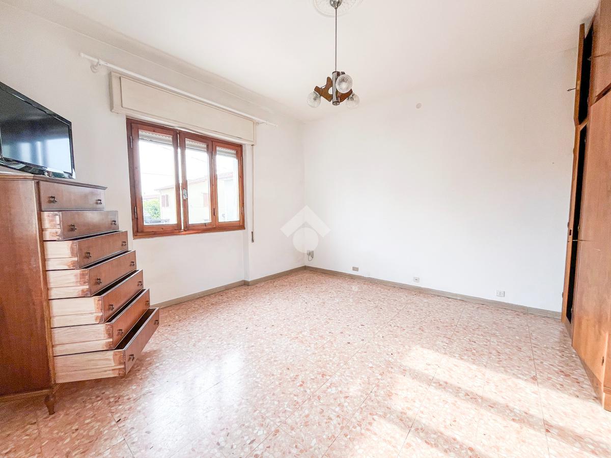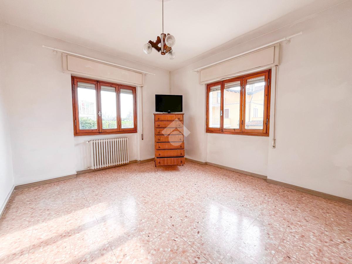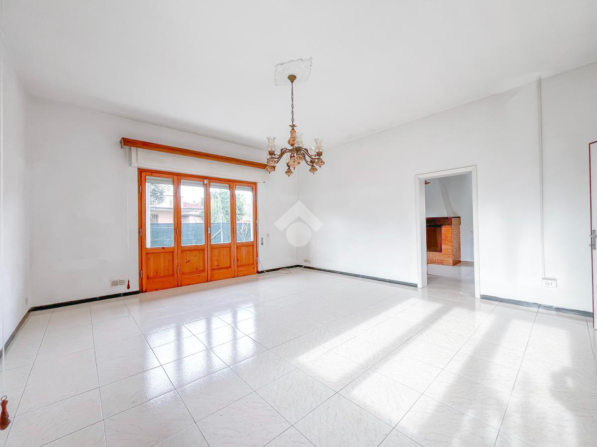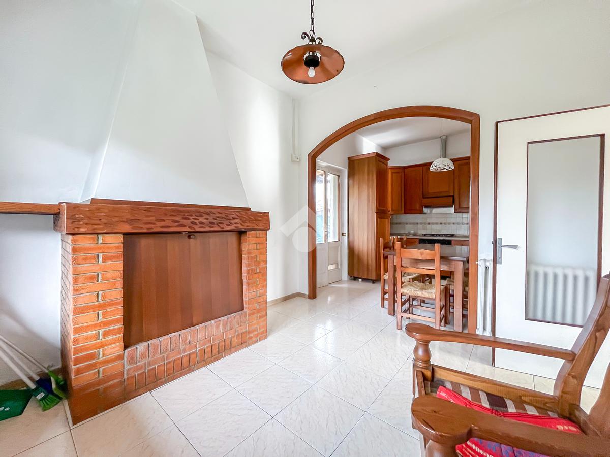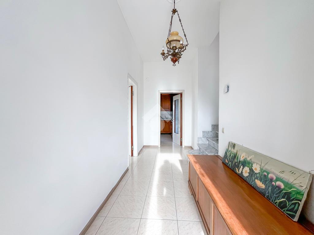L'immobile si presenta con ingresso nella corte piastrellata dove poter posteggiare due auto; tramite il disimpegno si accede alla zona giorno con ampia sala dotata di porte finestre che affacciano sul balcone. La cucina è abitabile con porta che conduce allo spazioso giardino sul retro.